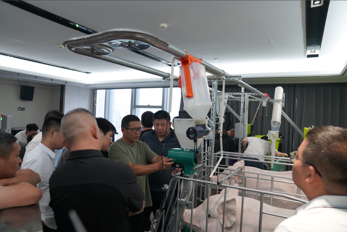 隨后潤農(nóng)羅清經(jīng)理介紹母豬飼喂器、懷孕飼喂器和粥料器等智能飼喂設(shè)備的應(yīng)用場景及價值點,展示飼喂器實物和講解安裝操作方法。接著至潤農(nóng)展廳進(jìn)行參觀,現(xiàn)場進(jìn)行設(shè)備安裝調(diào)控操作和控制平臺操作的培訓(xùn),確保每個服務(wù)老師能講、能裝、能調(diào)試、能維護(hù),為客戶實現(xiàn)膘體管控+潤農(nóng)飼喂器的“一條龍”服務(wù)。