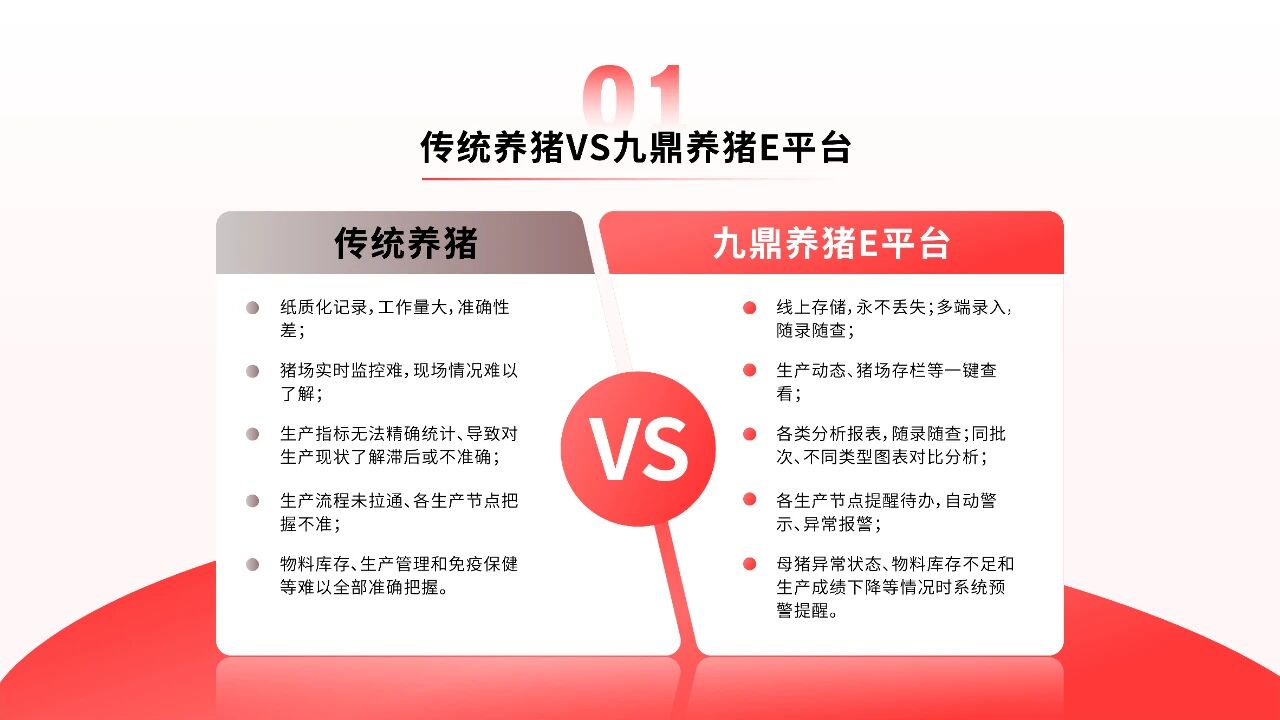 養(yǎng)豬E平臺(tái)是九鼎集團(tuán)專為規(guī)模豬場(chǎng)量身打造的專業(yè)數(shù)字化管理軟件。它深刻理解規(guī)模豬場(chǎng)的痛點(diǎn)和需求,通過精細(xì)的數(shù)據(jù)管理,讓養(yǎng)殖從靠經(jīng)驗(yàn)變?yōu)榭繑?shù)據(jù),從而實(shí)現(xiàn)生產(chǎn)過程全程可視、管理決策有據(jù)可依,為豬場(chǎng)決策和生產(chǎn)改良提供基礎(chǔ)和支持,運(yùn)用簡(jiǎn)單、實(shí)用、高效的工具提升養(yǎng)殖效益,為生豬產(chǎn)業(yè)高質(zhì)量發(fā)展注入數(shù)字動(dòng)能。