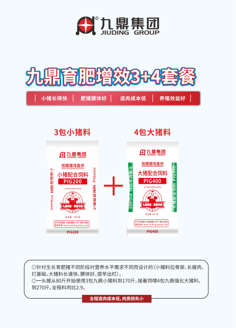 九鼎集團專注豬料生產(chǎn)研發(fā)29年,致力于為廣大養(yǎng)殖企業(yè)提供優(yōu)質(zhì)高效的飼料產(chǎn)品,在全國擁有分子公司近30家,年銷售飼料200萬噸,此次展會推出了全新的套餐系列: