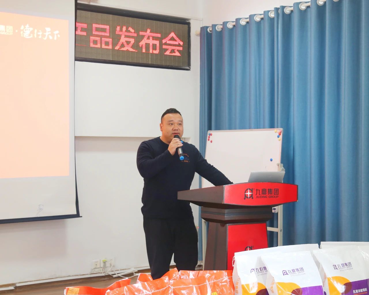 會議開始,集團總裁喻文鋒先生、副總裁徐波先生及參會的集團領(lǐng)導和各營銷公司總經(jīng)理們一同登上講臺,輕觸啟動按鈕,隆重宣告預配料線超吉大系列新產(chǎn)品—超吉大教槽料、CJD優(yōu)乳寶、CJD仔豬寶的正式發(fā)布。