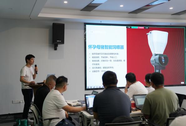 隨后潤農(nóng)羅清經(jīng)理介紹母豬飼喂器、懷孕飼喂器和粥料器等智能飼喂設(shè)備的應(yīng)用場景及價值點,展示飼喂器實物和講解安裝操作方法。接著至潤農(nóng)展廳進(jìn)行參觀,現(xiàn)場進(jìn)行設(shè)備安裝調(diào)控操作和控制平臺操作的培訓(xùn),確保每個服務(wù)老師能講、能裝、能調(diào)試、能維護(hù),為客戶實現(xiàn)膘體管控+潤農(nóng)飼喂器的“一條龍”服務(wù)。